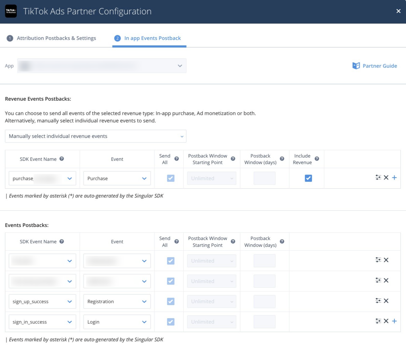 To verify your app and the TikTok App ID, please ensure that unattributed events are turned on in Singular's Partner Configuration by selecting "Send All". Once TikTok receives the first event, your app will be verified and you can start running campaigns. If you'd like, you can then stop sending unattributed events (although TikTok recommends to continue to send unattributed events).
