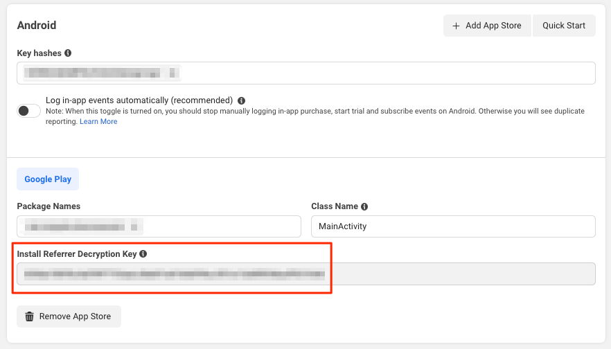 - Facebookパートナー設定を構成し、ステップ2.4に従ってMeta "Install Referrer Decryption Key" を提供する。