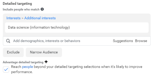 詳細ターゲティング:デモグラフィック、興味、行動などの詳細なターゲティングが適用される場合は、Advantage 詳細ターゲティングへのオプトインが必要です。
