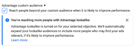 • 세부 타겟팅: 인구 통계, 관심사 또는 행동과 같은 세부 타겟팅이 적용되는 경우 어드밴티지 세부 타겟팅을 선택해야 합니다.