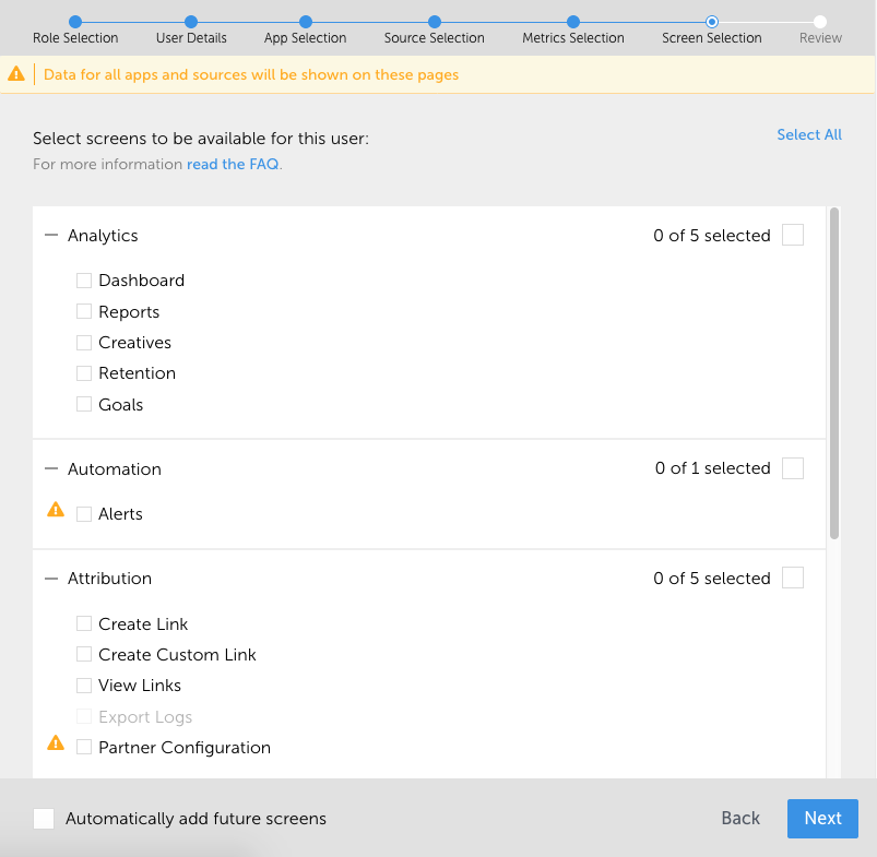 - Restricted 유형을 선택하면, 사용자 생성 과정에서 앱, 소스, 지표, 페이지에 대한 권한을 설정할 수 있습니다.