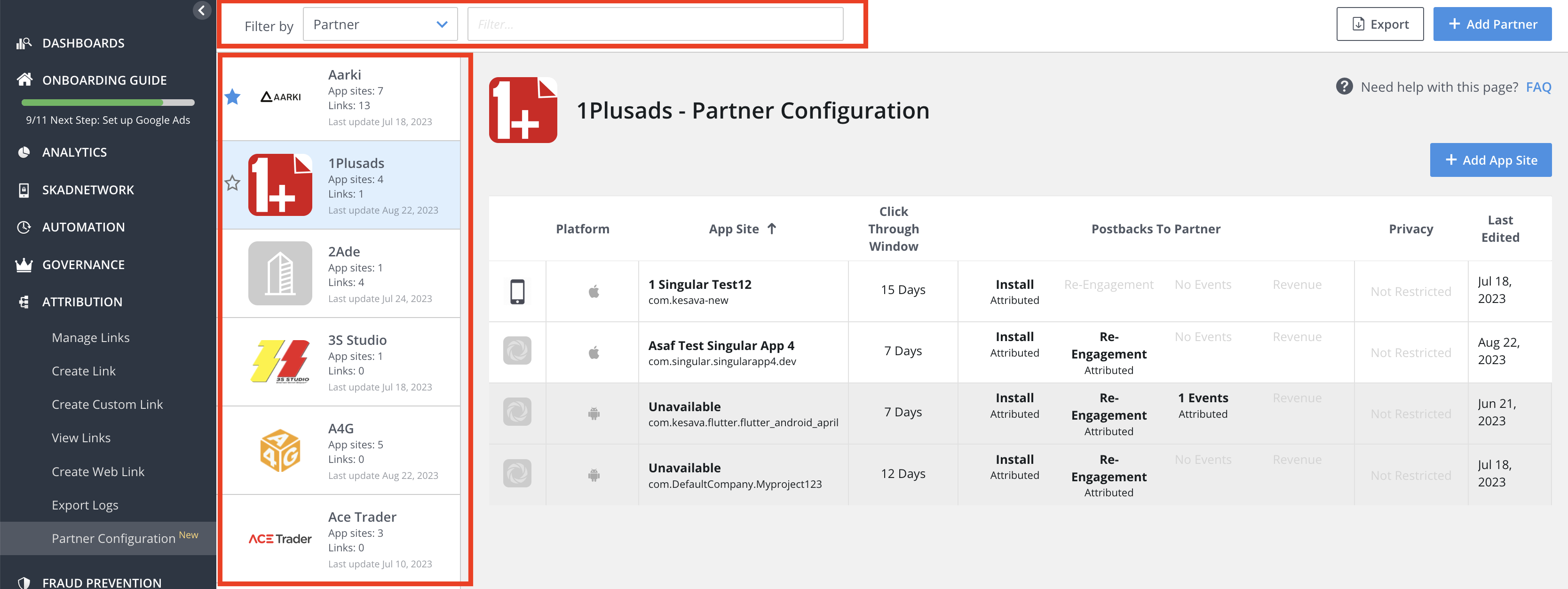 이렇게 하려면 어트리뷰션 > 파트너 구성 페이지로 이동하여 어트리뷰션 이벤트 데이터를 실시간으로 네트워크에 전송하도록 설정합니다. 설정이 완료되면 링크 관리*에서 추적 링크를 생성해야 하며, 이 링크는 파트너가 지원하는 경우 Singular를 통해 클릭과 노출을 어트리뷰션하는 데 사용됩니다.