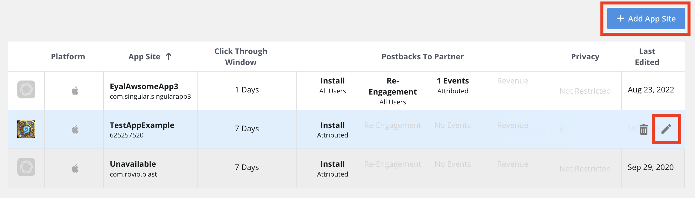 2. 구성 창이 열리면 파트너 설정/포스트백을 구성할 앱을 선택한 다음 앱 사이트 (플랫폼 버전)를 선택합니다. 앱 사이트별로 파트너를 별도로 구성합니다.
